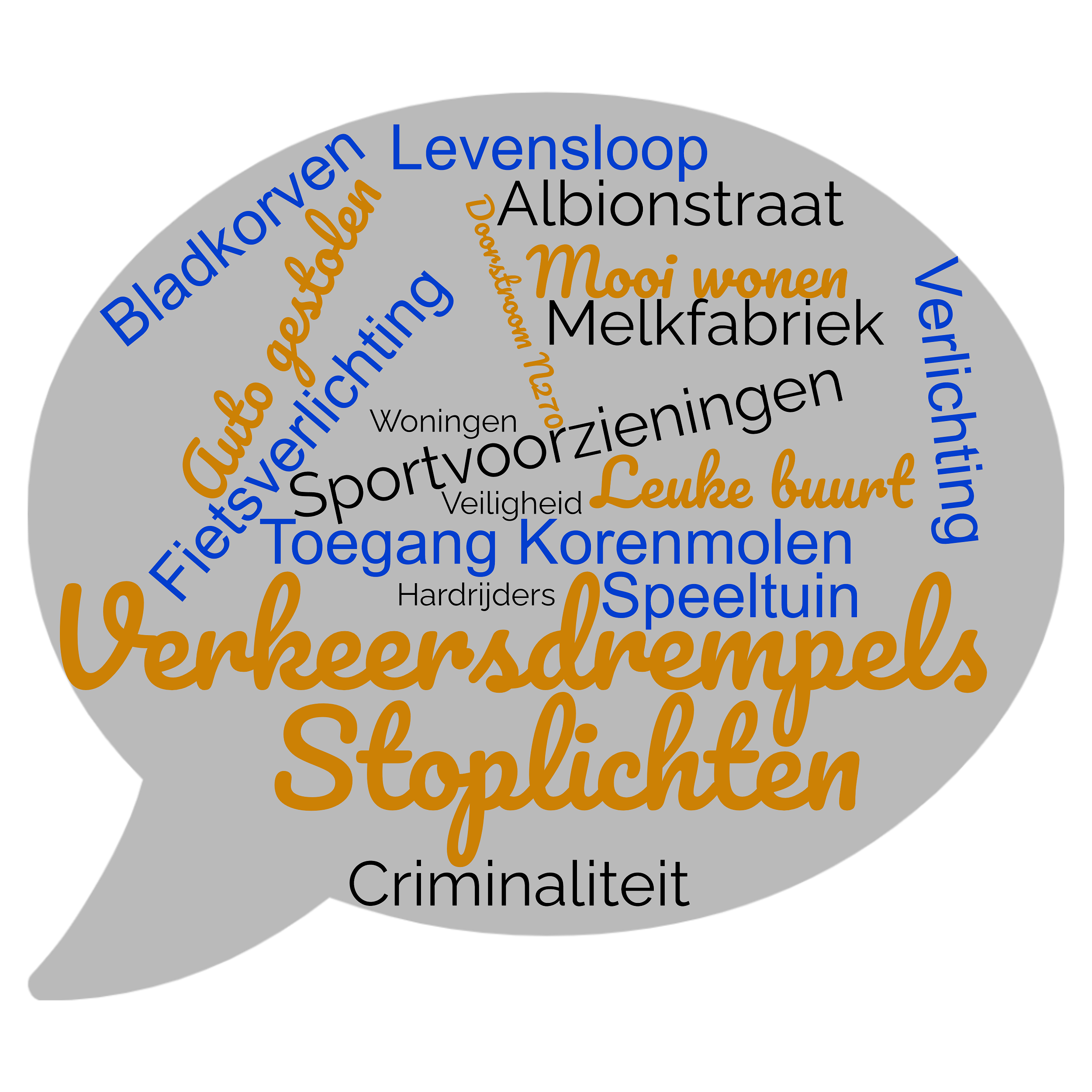 Uiteraard zijn er echter ook aandachtspunt- en verbeterpunten. Met name de verkeers- en algemene veiligheid en de “Melkfabriek” werden veel genoemd. In de woordwolk staan wat meer onderwerpen die we meekregen.